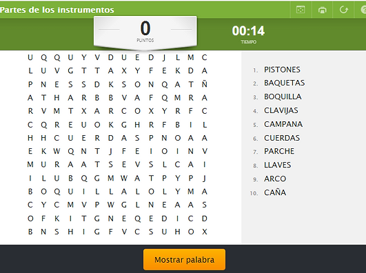 Encuentra en el siguiente crucigrama el nombre de algunas partes de los distintos instrumentos.
